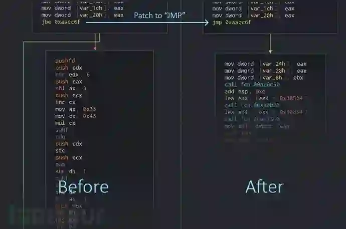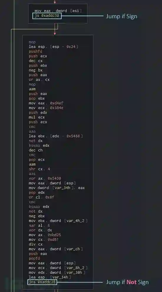 APT32在进行代码混淆处理时,大量使用了控制流混淆,并且向函数流中注入了大量垃圾代码块。这些垃圾代码块不会实现任何功能,只是为了混淆视听而已。