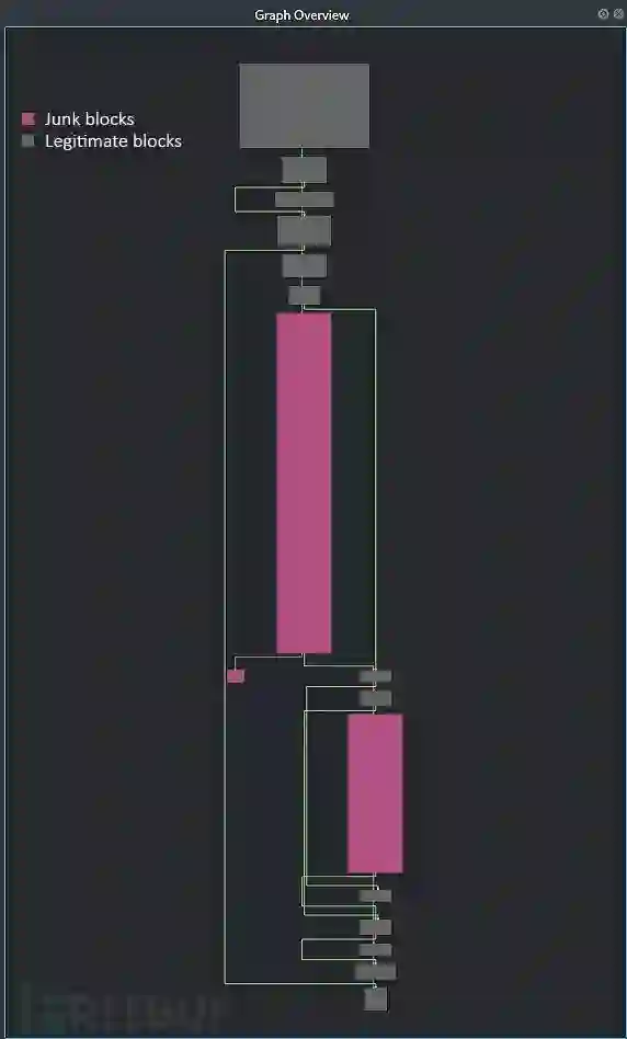 当满足这两个特征时,我们可以说第二个块很可能是垃圾代码块。这样,我们就可以将垃圾块从图表中删除了,并使用无条件跳转来修补源代码。