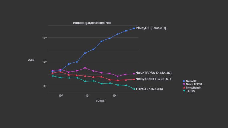 这个示例展示了使用 pcCMSA-ES 噪声管理原理(https://homepages.fhv.at/hgb/New-Papers/PPSN16_HB16.pdf)的 TBPSA 如何在表现上胜过几种替代方案。Facebook 研究团队在这里只将 TBPSA 与算法的一个有限示例进行了对比,不过,比起其他的方法,它的表现同样更好。