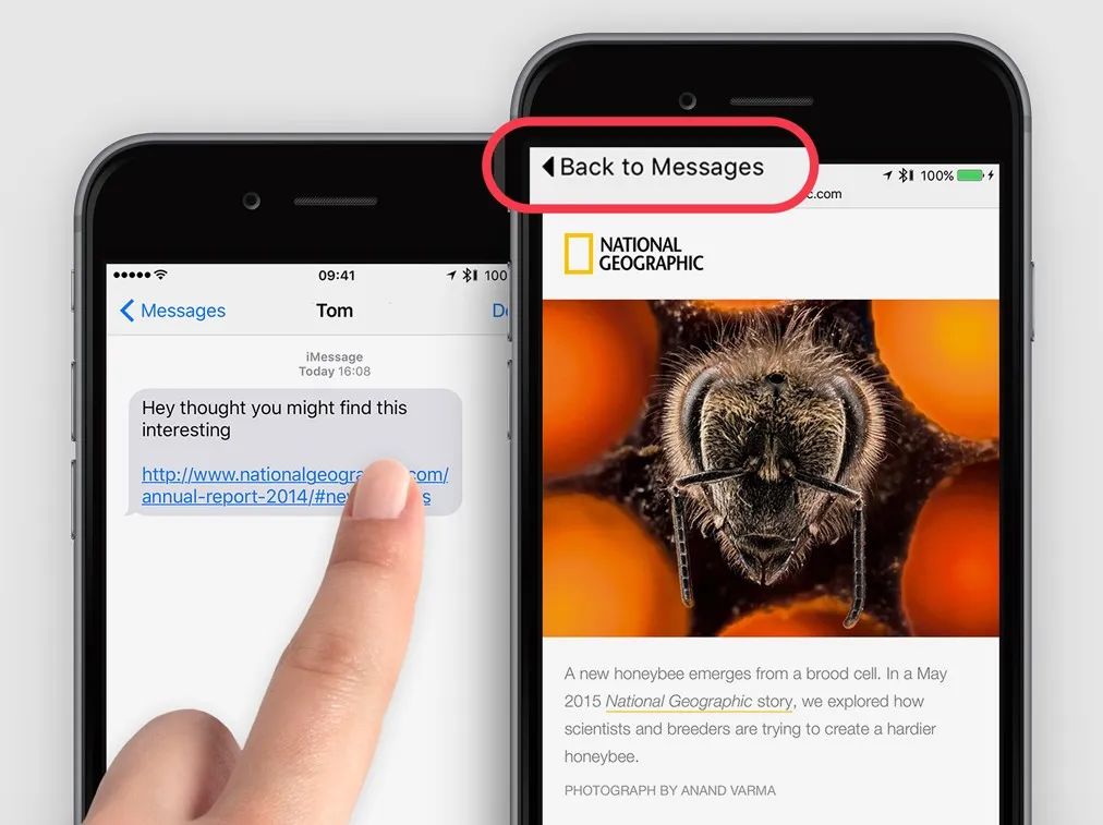 2015 年的 iOS 9 加入了锁屏下插入耳机自动播放音乐的功能,状态栏上沿的角落加入了返回上一个应用的按钮,Home 键的使用频率得以减少。