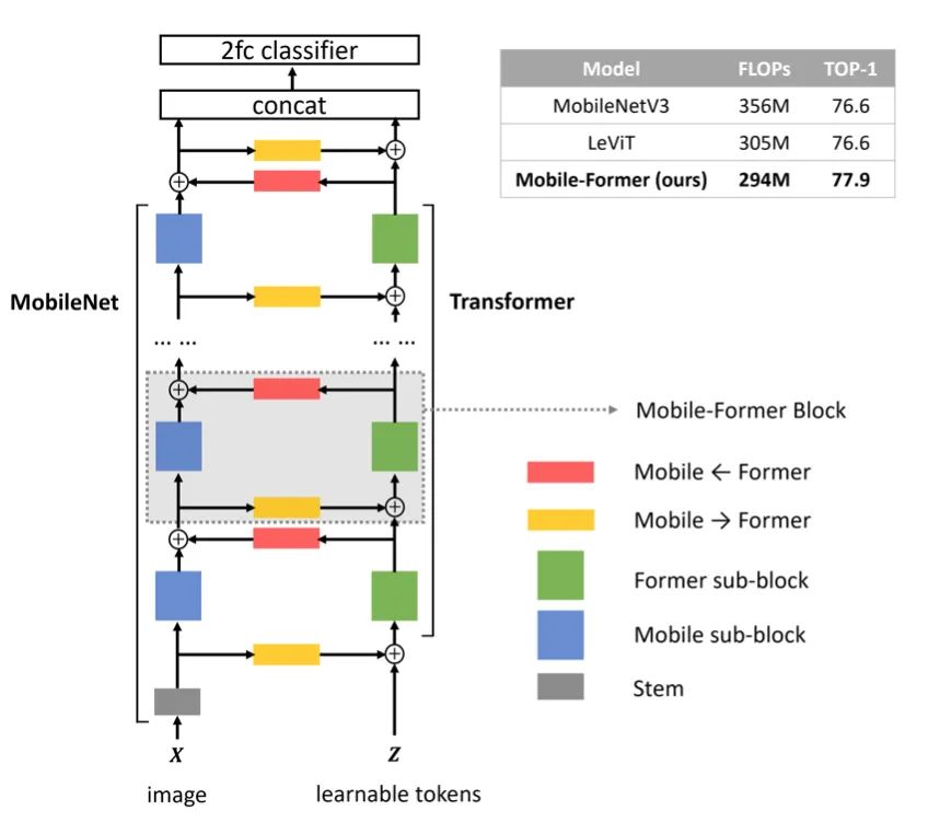 Mobile-Former是一种 MobileNet 和 Transformer 的并行设计,中间有一个双向桥,这种结构利用了 MobileNet 在本地处理和全局交互中的 Transformer 的优势,同时可以实现局部和全局特征的双向融合。
