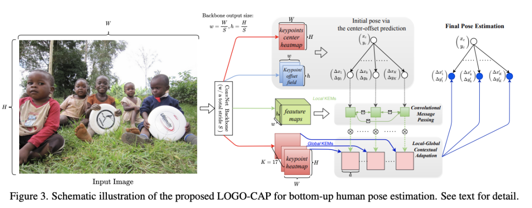 本文提出了一种多人姿态估计方法,称为 LOGO-CAP,通过学习人类姿势的 LOcal-GlObal 上下文适应。具体来说,本文的方法在第一步从小局部窗口中的局部关键点扩展图(KEM)中学习关键点吸引力图(KAM),随后将其视为以关键点为中心的全局热图上的动态卷积核,以进行上下文适应,实现准确的多人姿态估计。该方法是端到端可训练的,在单次前向传递中具有近乎实时的推理速度,在自下而上的人体姿态估计的 COCO 关键点基准上获得了最先进的性能。