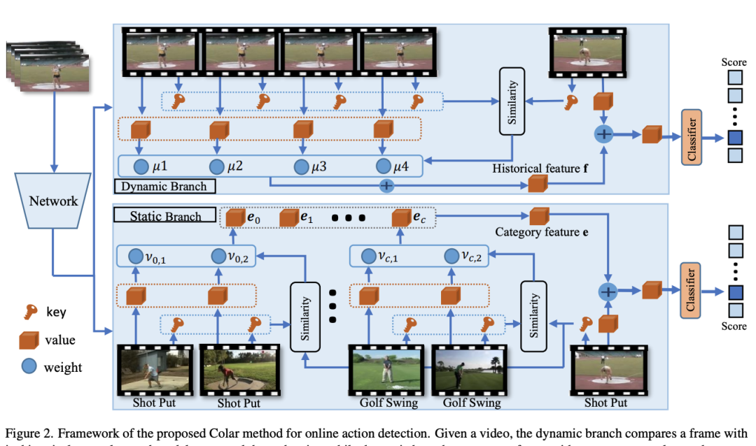 当前的工作模拟历史依赖关系并预测未来以感知视频片段中的动作演变并提高检测准确性。但是,现有的范式忽略了类别级别的建模,对效率没有给予足够的重视。本文开发了一种有效的示例咨询机制,该机制首先测量框架与示例框架之间的相似度,然后根据相似度权重聚合示例特征。这也是一种有效的机制,因为相似性测量和特征聚合都需要有限的计算。基于样例协商机制,可以将历史帧作为样例来捕捉长期依赖关系,将某个类别中的代表性帧作为样例来实现类别级建模。