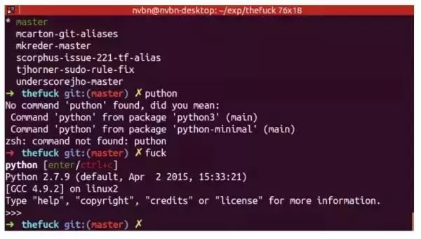 19.thefuck:用途是每次命令行打错了以后,打一句fuck就会自动更正命令。比如apt-get打成了aptget。fuck以后自动变成apt-get。但还是没加sudo。再fuck,成功!