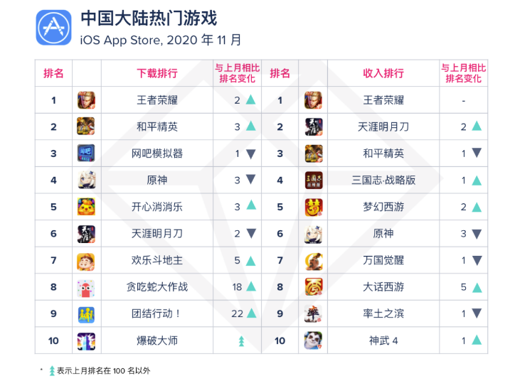据 App Annie 数据显示,11 月中国大陆热门游戏收入榜单中,腾讯包揽前三,上线一个月古龙 IP 加持的《天涯明月刀》收入首次超过《和平精英》,占收入排行榜第 2 名。网易《大话西游》重新回到收入排行榜前十的位置,上榜的还有该公司的游戏《梦幻西游》。全球游戏收入榜单较上个月相比并无明显变化,刚刚获得 App Store 以及 Google Play 双榜年度最佳游戏的《原神》,在收入排行榜第一。