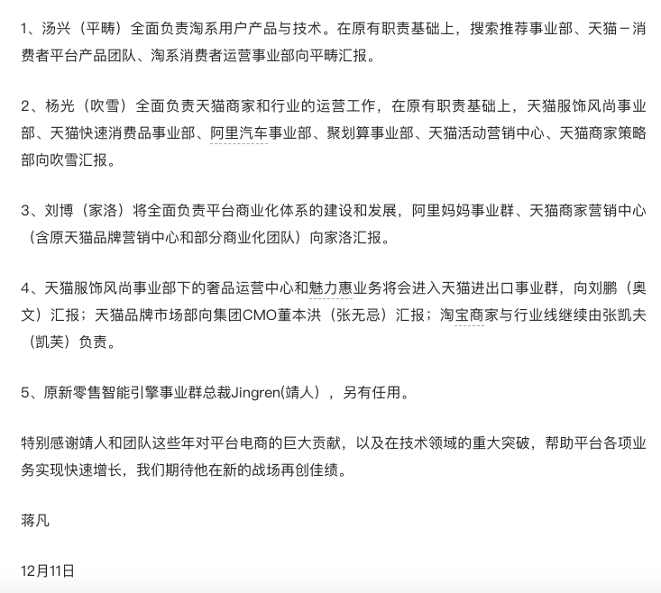 12 月 11 日,阿里巴巴集团发布新一轮组织架构调整信息。此次调整主要针对核心电商业务,目前多个职位进行了调整,涉及多个高 P 高管:汤兴(花名:平畴)全面负责淘系产品技术,杨光(花名:吹雪)全面负责天猫运营。据悉,此轮调整后,天猫将着重发力海外业务。