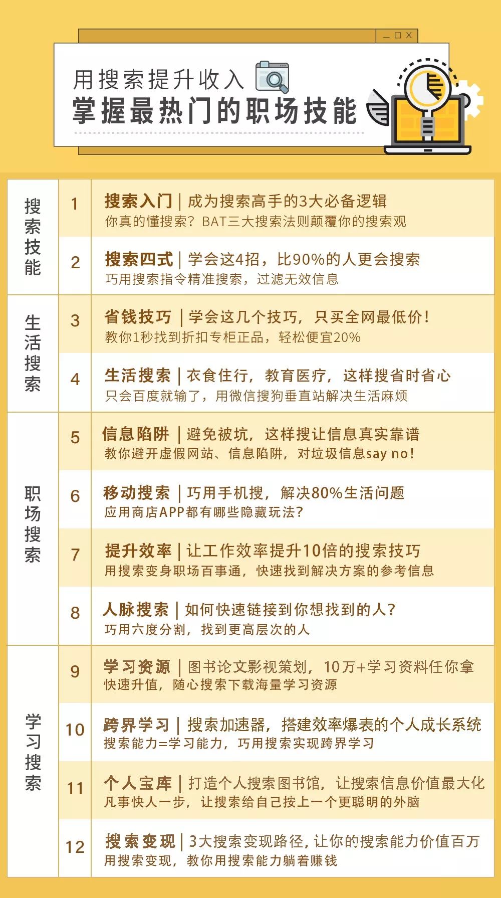 实用技能:完整交付独创3S搜索系统+BAT搜索逻辑,30+种搜索技巧,涵盖购物医疗理财人脉学习工作等各方方面面,快速找到任何你想要的信息资源人脉。