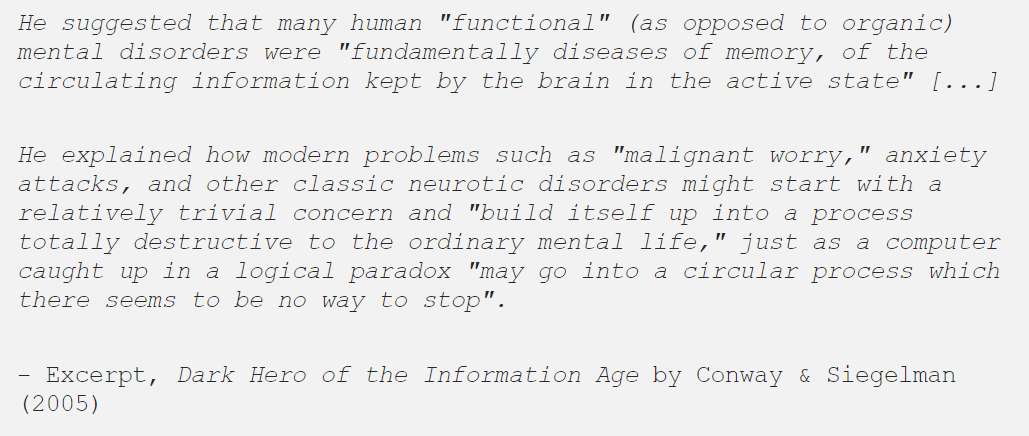 维纳认为「社会对心理疾病的理解将从新型类脑计算机器提供的经验中受益良多」,这或许令人吃惊 (Conway & Siegelman, 2005):