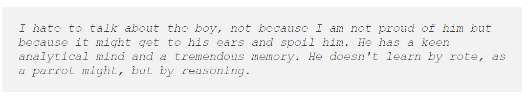 尽管维纳极具天赋,但 Leo 仍不失为一位严苛的教师,他的标准很高。在维纳犯错时,父亲 Leo 会「极为挑剔和苛刻」。正如维纳在其自传《昔日神童》(1953) 中记述的那样: