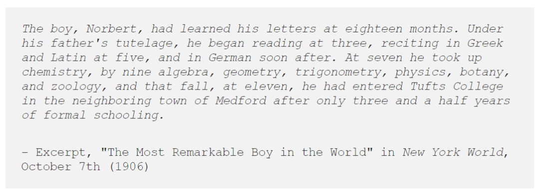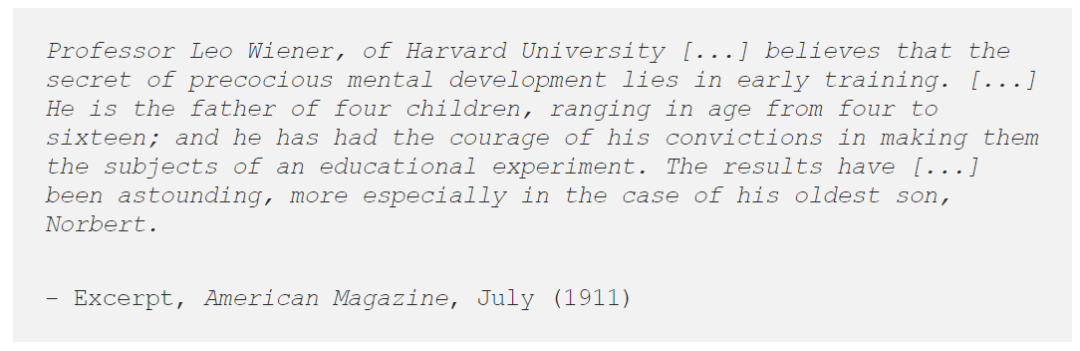 关于对维纳的教育方法,Leo 的公开讲述和真实情况存在极大差异。例如,阅读 Leo 本人对如何让孩子变成天才的记录后,你会发现表扬和认可孩子的能力并非其教育哲学的主要部分 (Heims, 1980):