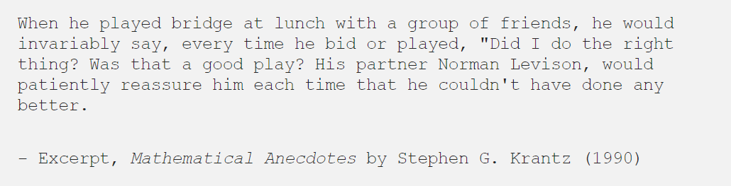 维纳的确非常没有安全感。根据 Nasar (1998) 的记述,维纳会紧张地询问自己的名字是否出现在人们正在阅读的书籍中: