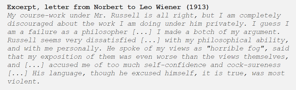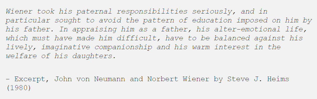 最重要的是,从维纳的自述中,你会发现父亲 Leo 的言论对他造成了一定程度的负面影响 (Wiener, 1953):