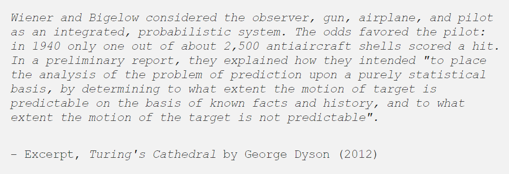 正如维纳在演讲中讲述的那样,他对新兴的数字计算理论的初次尝试并未在二战中立即发挥作用,因此维纳转而寻求其他方向。他的第二次尝试与武器有关,具体来说是防空武器: