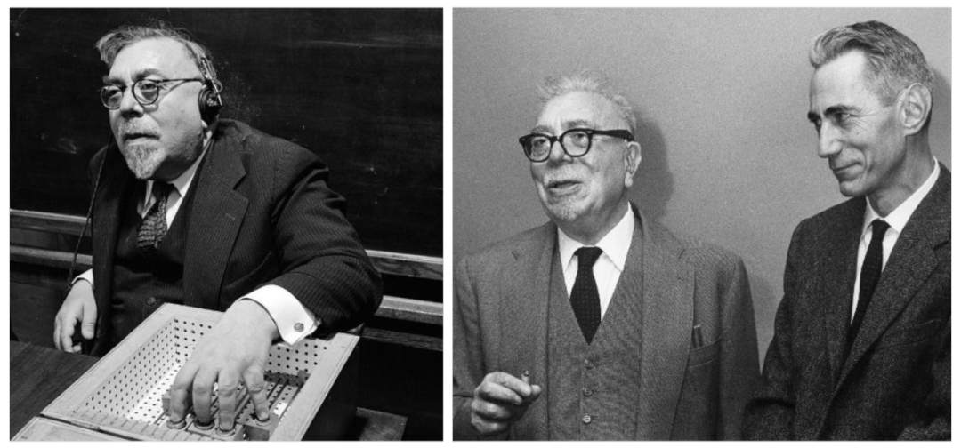 左图:维纳正在测试专用型「相关器」(correlator)计算机。右图:维纳和信息论之父克劳德·香农(图源:MIT 博物馆)