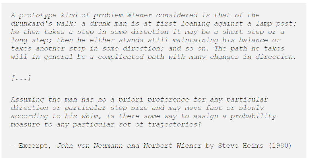 维纳认为「开发针对轨迹集合的概率测度是一件很有数学趣味的事情」,并研究这一现象 (Heims, 1980):