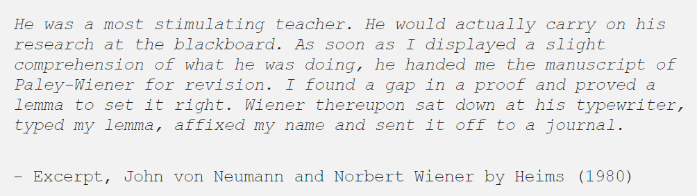 维纳带的博士生很少。在 Heims (1980) 中,他的博士生之一 Norman Levinson (1912–1975) 记录了与维纳的合作经历: