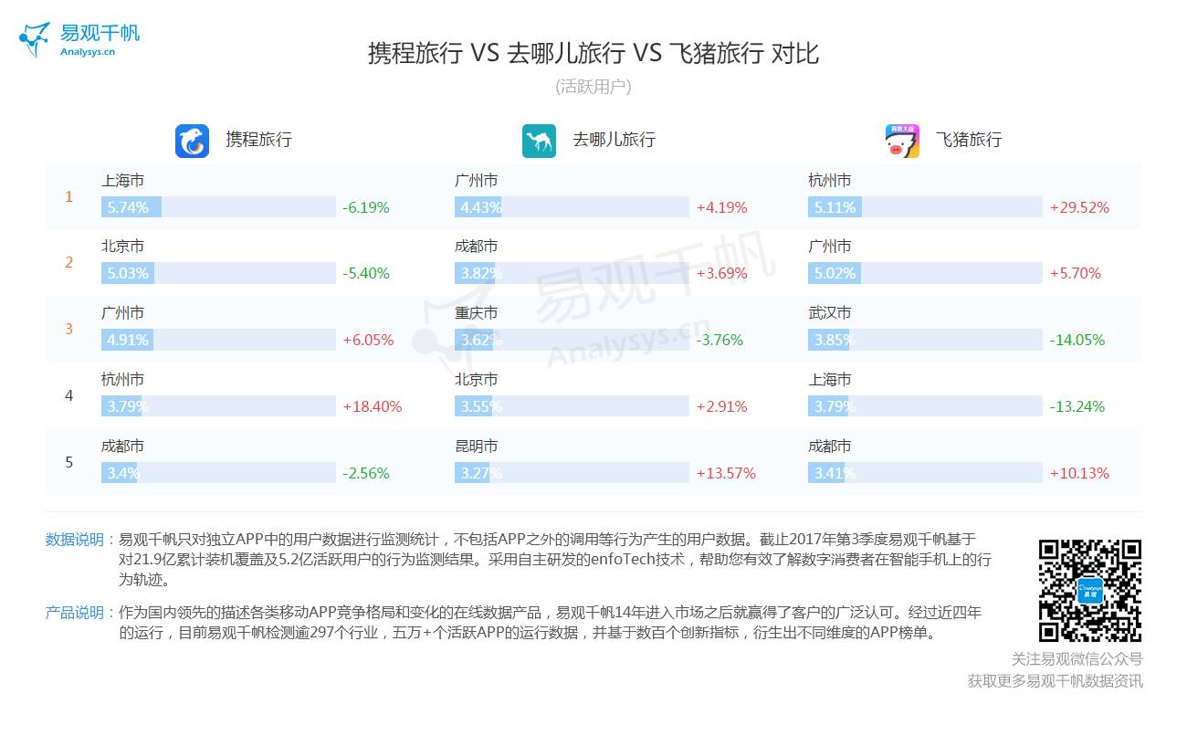 而在城市分布上,前三甲的变化都很明显,携程和飞猪在上海市和杭州占比最高,这两地也是这两家公司的总部,使用飞猪旅行的TOP5中,杭州、武汉、成都,三个一线城市入围,超一线城市有广州和上海。