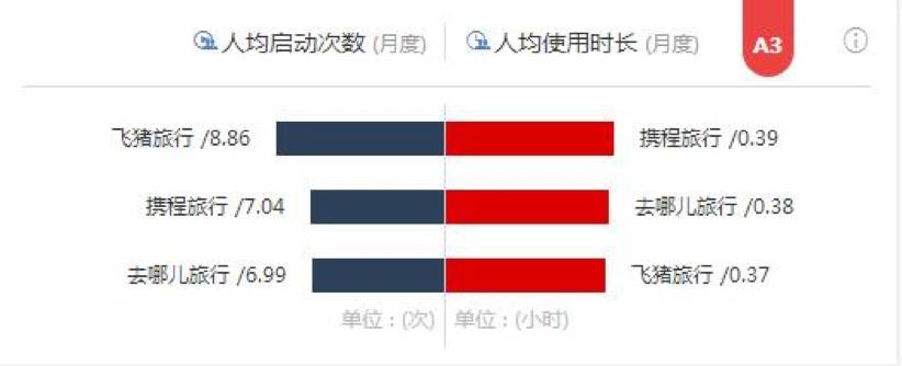 在使用时长方面,更能看出前三甲的区别,阿里巴巴旗下的,飞猪旅行人均月度启动次数达到了8.86次,高于携程和去哪儿,而且在月度使用时长上飞猪旅行达到0.37小时,和携程的0.39小时和去哪儿的0.38小时差别甚小,不仅如此,飞猪旅行也会通过阿里系的产品进行导流,产品粘度进一步增强。