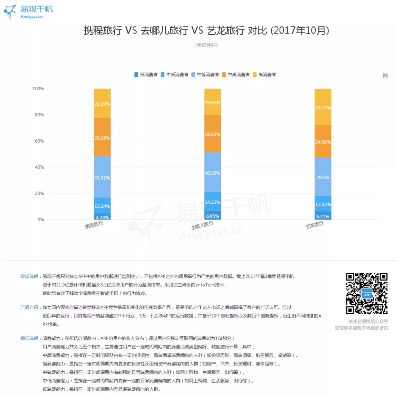 自2015年携程并购去哪儿入股艺龙后,携程系已经占据绝大部分市场。携程旅行的高端及中高端消费者用户占比比较大,高端用户达到22.19%,中端消费者占据29.28%,而去哪儿的高端用户在19.91%,中高端用户在28.63%。另外,去哪儿的低消费者和中低消费者占比分别达到6.85%和14.32%,同比携程的低消费者4.78%及12.24%要高出一些,艺龙的高消费人群达到27.77%。