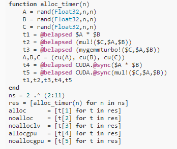 对于初学者来说,可以先测试一下假设1和2,通过一段Julia代码来测试内存申请时间、GPU运算时间等。