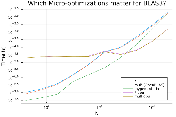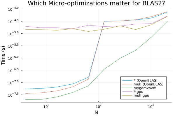 但同时也可以看到,在lower end有可能出现一些相当显著的性能提升,这些收益是通过使用纯Julia LoopVectorization.jl实现的,因为标准的BLAS工具在这个区域往往有额外的线程开销(同样,在这个区域没有进行优化)。