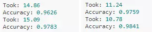 在batch size为2048的情况下训练10个epoch,用PyTorch在A100上训练两次耗时为17.66和17.62,准确率分别为94.91%和96.92%;在V100上训练时间为16.29和15.94,准确率分别为95.6%和97.5%