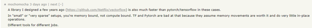 有网友表示十分赞同:「不同的任务用不同的工具」,因为TF和pyTorch消耗了大量的内存,并且没有原地操作,所以在小模型上很浪费时间。他数年前在Netflex时就设计开发了一个D语言的框架vectorflow,目前在github已获1200个stars
