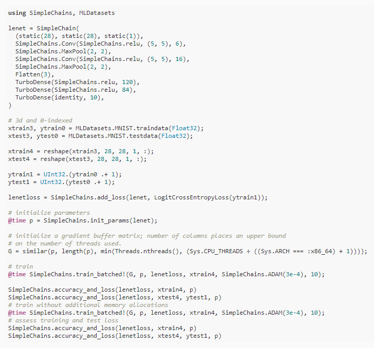4. 使用「纯Julia」编写,更方便开发和优化;在大量使用LoopVectorization.jl的同时,SimpleChains.jl并不依赖任何BLAS或NN库。