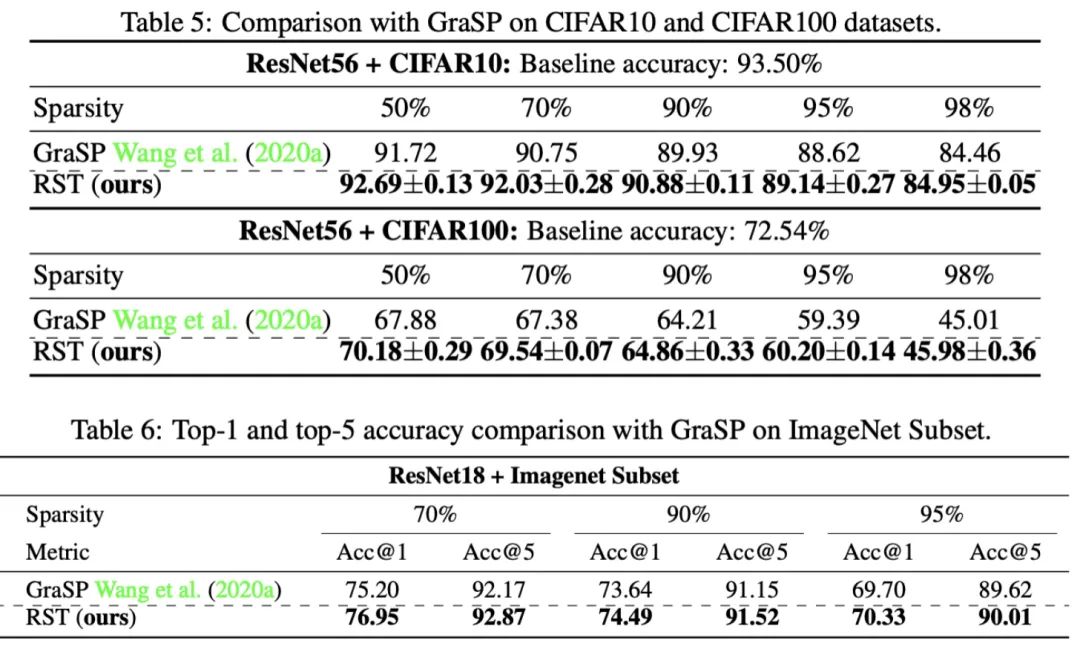 对比Pruning at Initialization(PI):PI同样在随机网络中选择子网络进行训练。因此,PI相关的研究同样也是重要的对比方法。文章中,作者选择了Gradient Signal Preservation (GraSP)作为PI方法的代表,与提出的RST进行比较。具体结果如下图所示。