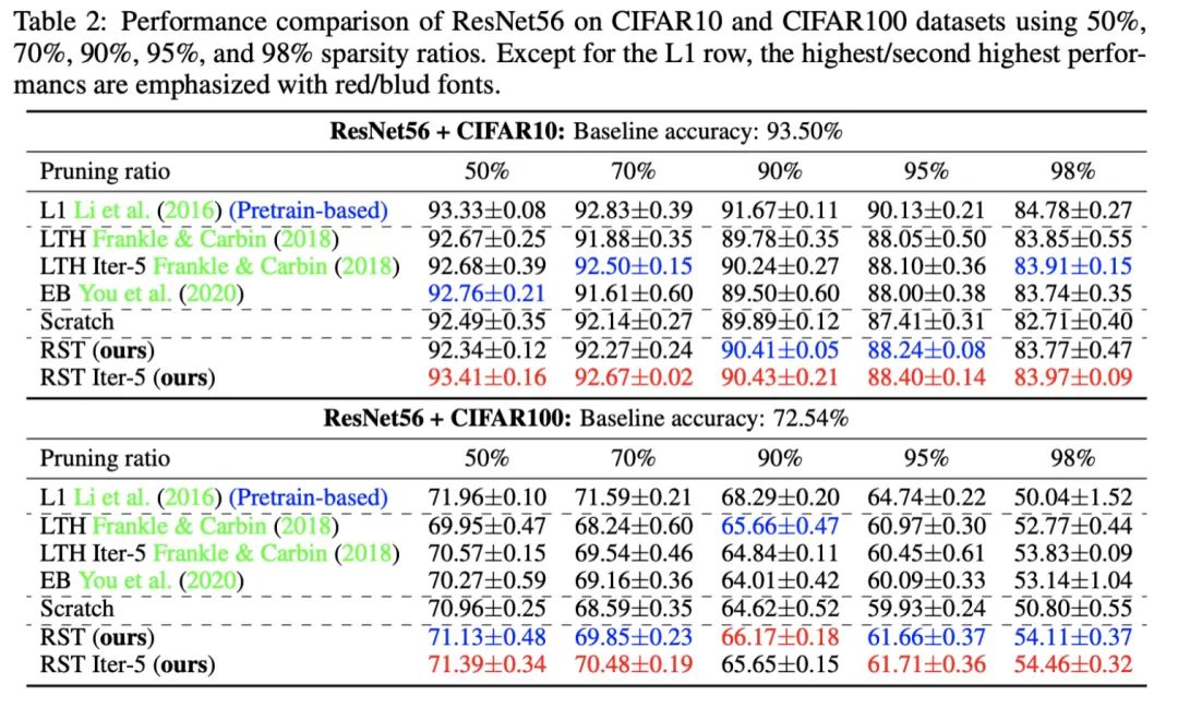 RST方法在cifar10,cifar100以及Imagenet 数据集上进行了测试。模型选择了ResNet56和ResNet18。对比方法包括LTH及其变体,预训练加剪枝,以及随机子网络scratch training。实验结果如下图所示。