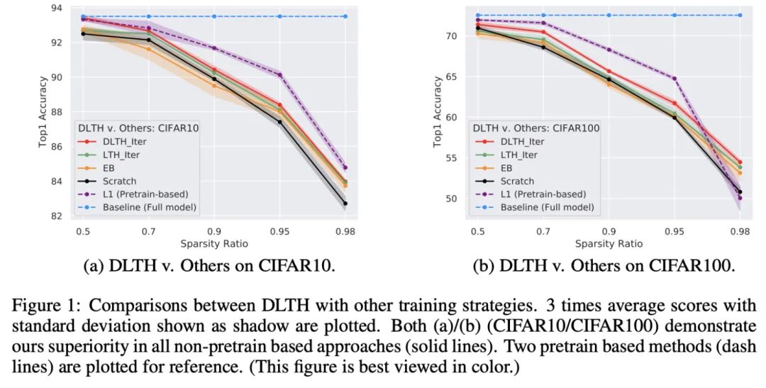 作者发现RST方法相比较于LTH,普遍可以得到更好至少相当的结果,无论使用one-shot的策略或者iterative的策略。因此,所使用的RST很好的验证了文章提出的DLTH。直观的比较如下图所示。