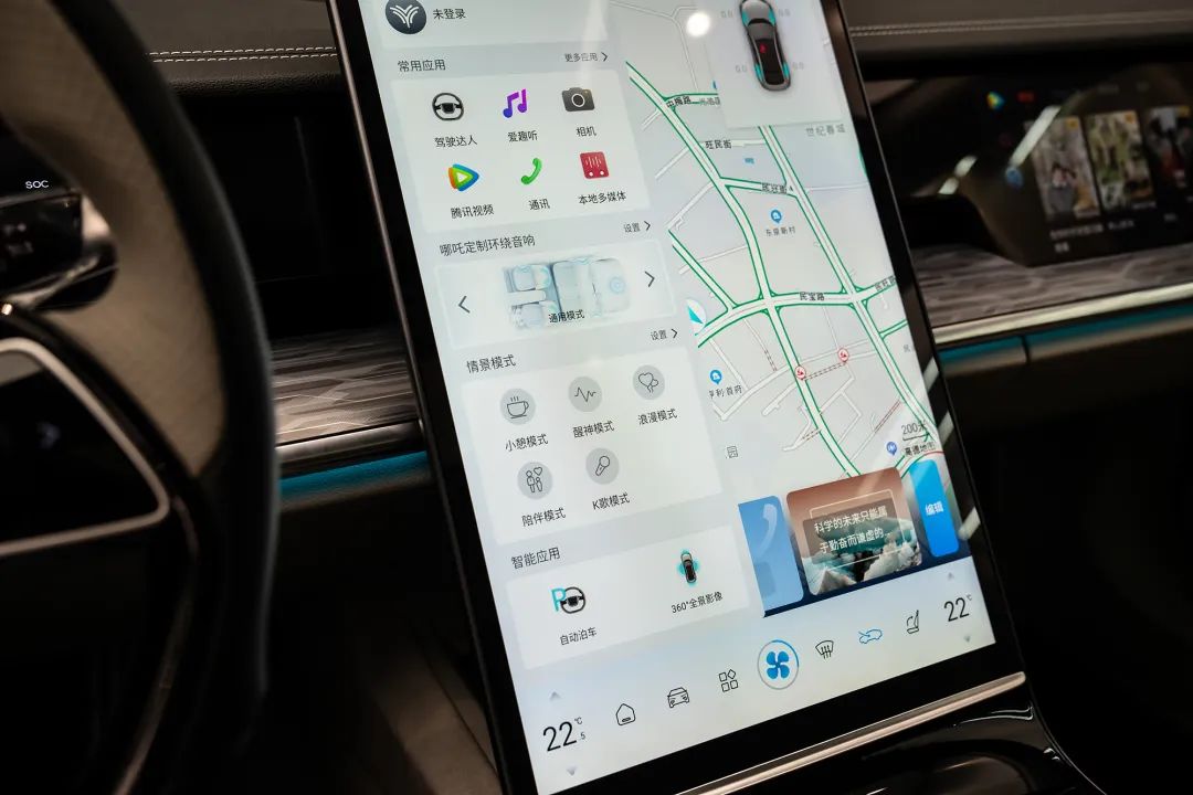 基础的屏幕触控操作方面,因为有了 8155 处理器加持,系统对用户的反应速度还不错,加上主要按钮设计的尺寸都比较大,也缩减了误触的几率。不过有一点需要吐槽,或许 UI 设计师在下一个大版本 OTA 可以考虑用线条更粗的文字和图标,这样特别是在白天,可以减少哪吒 S 用户辨认按钮、开关的耗时,用起来更方便。
