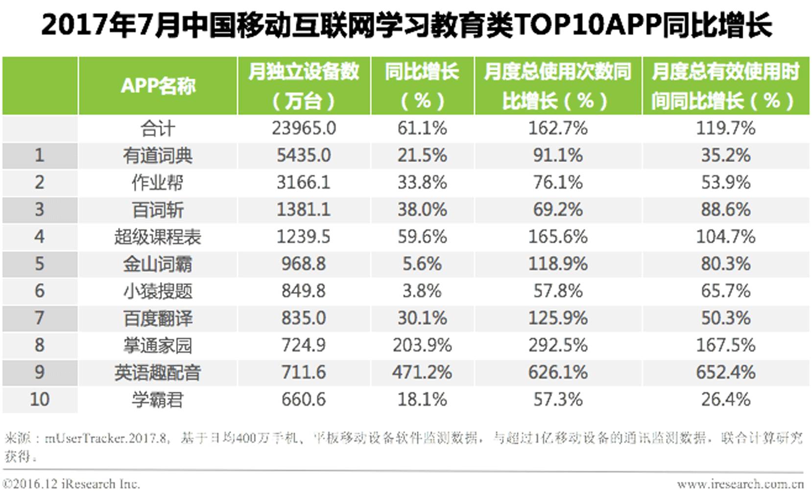 7月学习教育类按月独立设备数排序TOP5APP分别为有道词典5435万台、作业帮3166万台、百词斩1381万台、超级课程表1240万台和金山词霸969万台,其中超级课程表月度总使用次数同比增长165.6%、月度总有效使用时间同比增长104.7%,金山词霸月度总使用次数同比增长118.9%,未来增长潜力较大。
