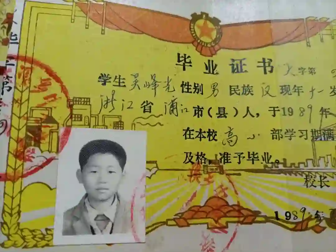 1984 年,7 岁的吴峰光在本村的大溪中心小学上一年级,他长相很憨,胖嘟嘟的。“我那时身体不好,经常流鼻涕,学习也成绩不好。”同学们叫他“蝌蚪”,在浦江话里的意思就是说一个人很“憨傻”。直到吴峰光上了三年级,学习上发生了转机。