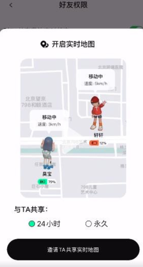 啫喱支持好友共享实时地图,可以选择24小时也可以选择永久地共享时长,该功能正是此前也爆火了一段时间、基于LBS的社交产品“Spot”。