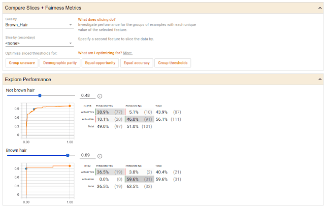 你还可以探索不同分类阈值所带来的不同影响,下方的截图展示了另一个微笑监测模型的结果,他在开源的CelebA数据集上进行的训练,该数据集含有经过标记的名人人脸图像。在下方的案例中,数据集中的人脸根据头发颜色进行了分类,每两组数都有一个ROC曲线和针对预测的混淆矩阵,以及设置了模型判断人脸在微笑的信心有多少。在这个案例中,两组数据的置信区间是用该工具自动设置的,从而保证公平性。