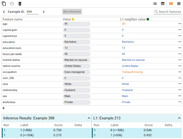 在下方的截图中,这款工具就用到了一个二元分类模型上,它是根据UCI的人口普查数据来判断某人的收入是否大于5万美元。这是很多机器学习研究者都会用到的预测模型,尤其是分析算法的公平性时。在这个案例中,对于选择的数据点,模型预测出的结果有73%的置信度认为该人的收入高于5万美金。该工具自动定位了数据集中另一位与之相似的对象,但模型预测他的收入小于5万美金,并将这两个目标进行了比对。在这种情况下,对年龄和职业进行稍稍改动,模型的预测就有了变化。