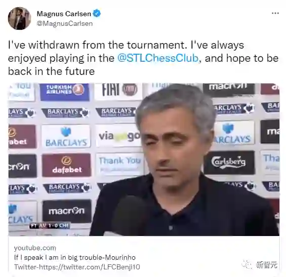 但他在发的推特上并没有说退出理由,甚至还表示很享受比赛过程,希望未来还能回来,不过配的视频却是葡萄牙足球经理何塞·穆里尼奥接受采访时说的一段话:「如果我说了,我就有大麻烦了。」