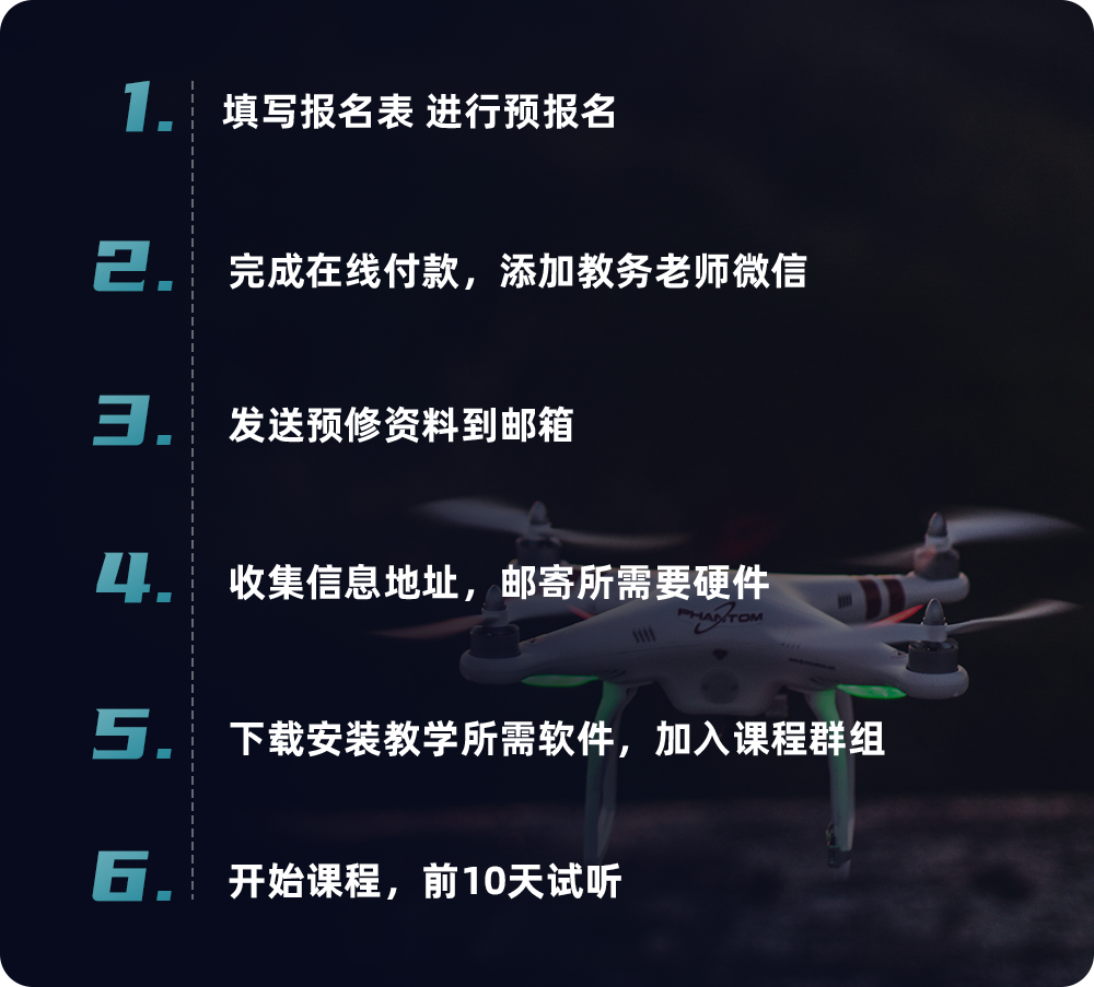 在正式课程开课十日内,学员可以提出无理由退款,将无理由退还全部课程费,不退还无人机硬件等的费用。你可以安心购买课程开启新的征程!
