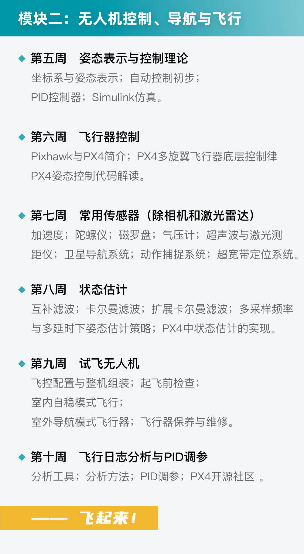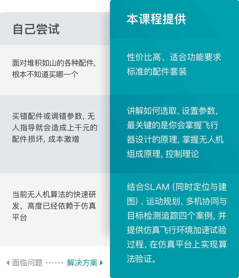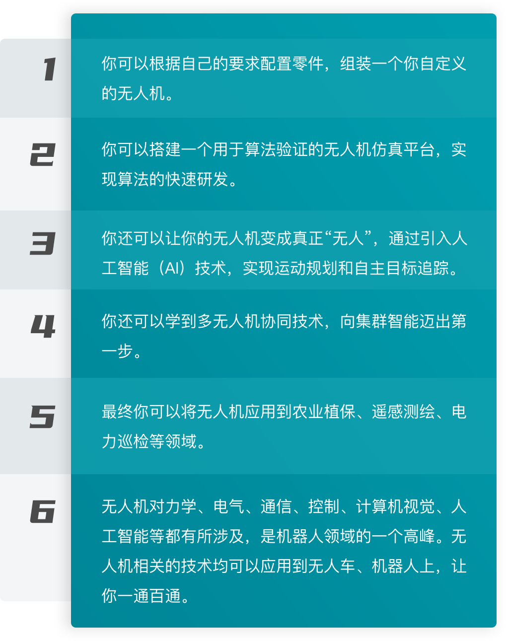 我们的课程并不是简单的拼装课程,更涉及到飞行器设计、仿真平台搭建和算法实现的整体流程。我们课程将会教你无人机的基本组成、飞行原理、控制理论、状态估计、同时定位与建图、运动规划、目标检测追踪与多无人机协同;