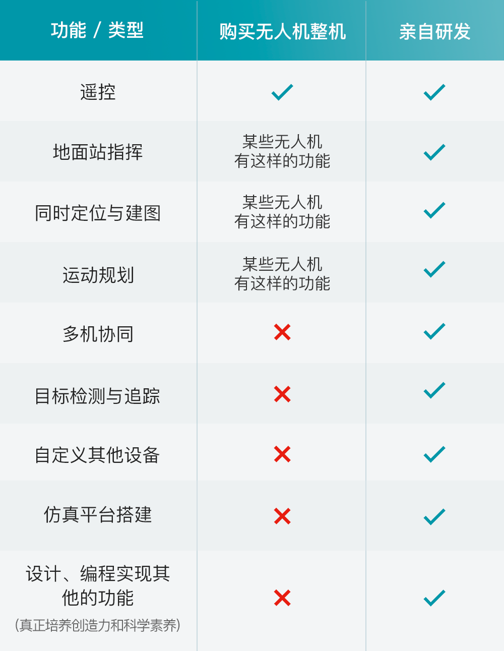 那么,直接购买无人机和我们的课程研发无人机的区别在哪里呢?请看下图: