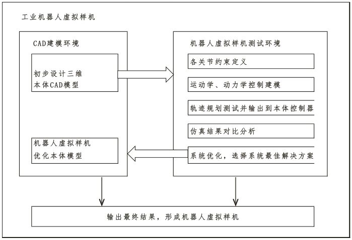 机器人虚拟样机将机器人技术与虚拟仿真技术相结合,针对于机器人设计与制造过程中的运动学、动力学分析,轨迹和路径规划,机器人与工作环境的相互作等技术内容进行研究与系统开发,在虚拟环境中完成机器人的设计、分析及虚拟生产过程的实现。系统的具体构成如下图 2。