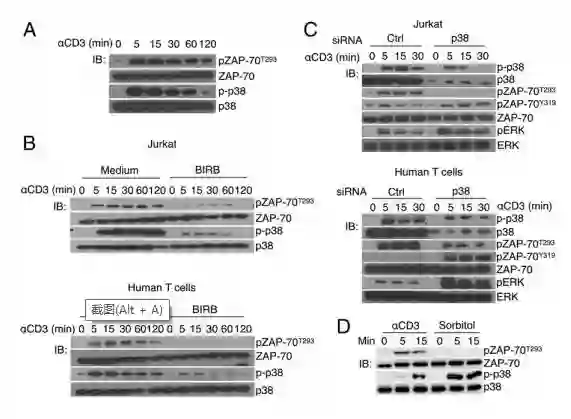 p38在体外和TCR激活的T细胞中磷酸化ZAP-70
