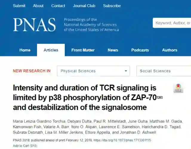 2.Maria Letizia Giardino Torchia el al., "Intensity and duration of TCR signaling is limited by p38 phosphorylation of ZAP-70T293 and destabilization of the signalosome," PNAS (2018).
