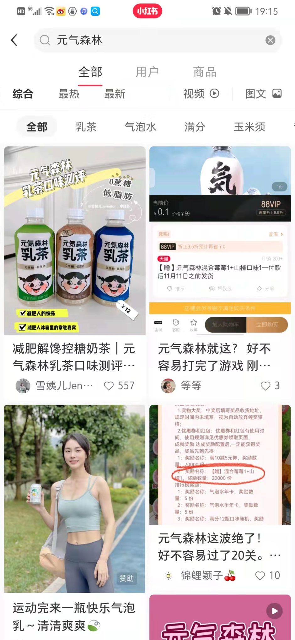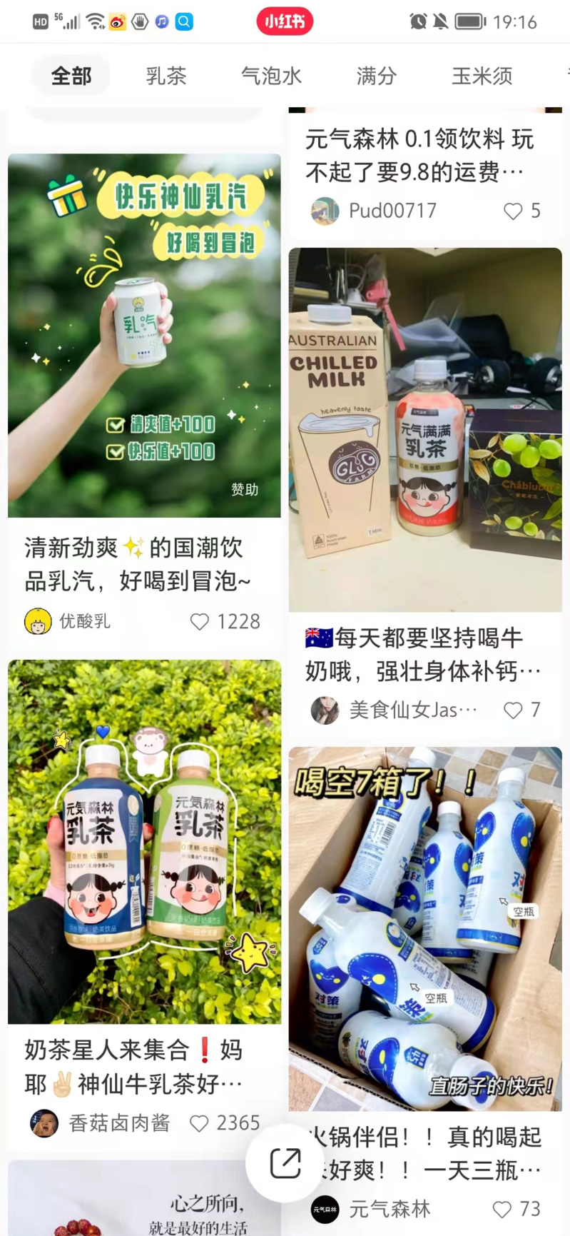 首先是靠目前非常成熟的平台进行推广,元气森林通过抖音、快手、淘宝、天猫等主流平台,进行推广合作。打开小红书你会发现,有关元气森林的笔记7w+,诸如火锅伴侣、控糖奶茶,快乐气泡水、神仙牛乳茶等……