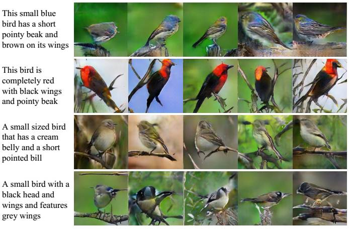 文字可以看做是图像的一种抽象描述,试想一下根据文字描述来绘制一张图片的难度。如果交由GAN来做,生成的图像又会是怎样的呢?图4展示了GAN按文本绘图的表现效果。可以看到GAN的绘制效果还是相当震撼的!