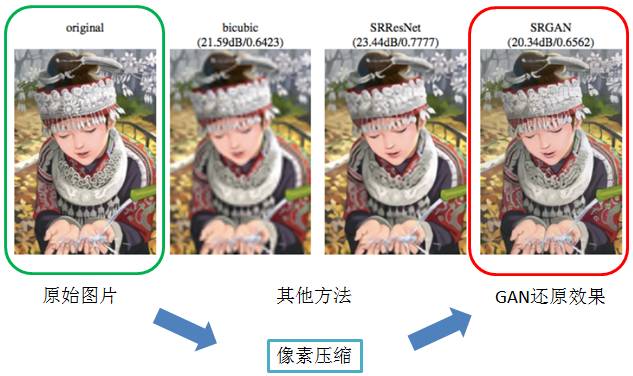 超清图像的还原可以用于图像的加解码及其相关应用。例如,在线视频对其就有很强的应用需求。图1展示了GAN对于超清图像的还原效果,可以看到GAN是目前对超清图片还原效果最佳的模型之一。