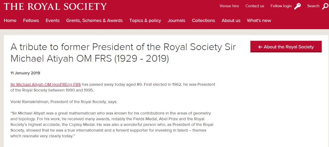当地时间1月11日,89岁的数学家迈克尔⋅阿蒂亚爵士(Sir Michael Francis Atiyah)去世,英国皇家学会发布讣告。