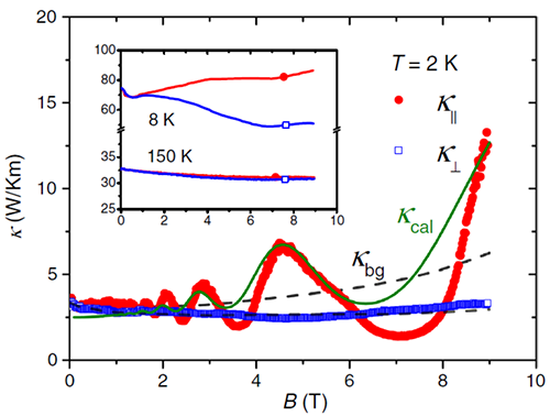 图三:磁场平行和磁场垂直时的热导率对比。巨大的热导率量子振荡主要发生在平行磁场时,其量子振荡可以半定量地用手性零声模型来拟合。