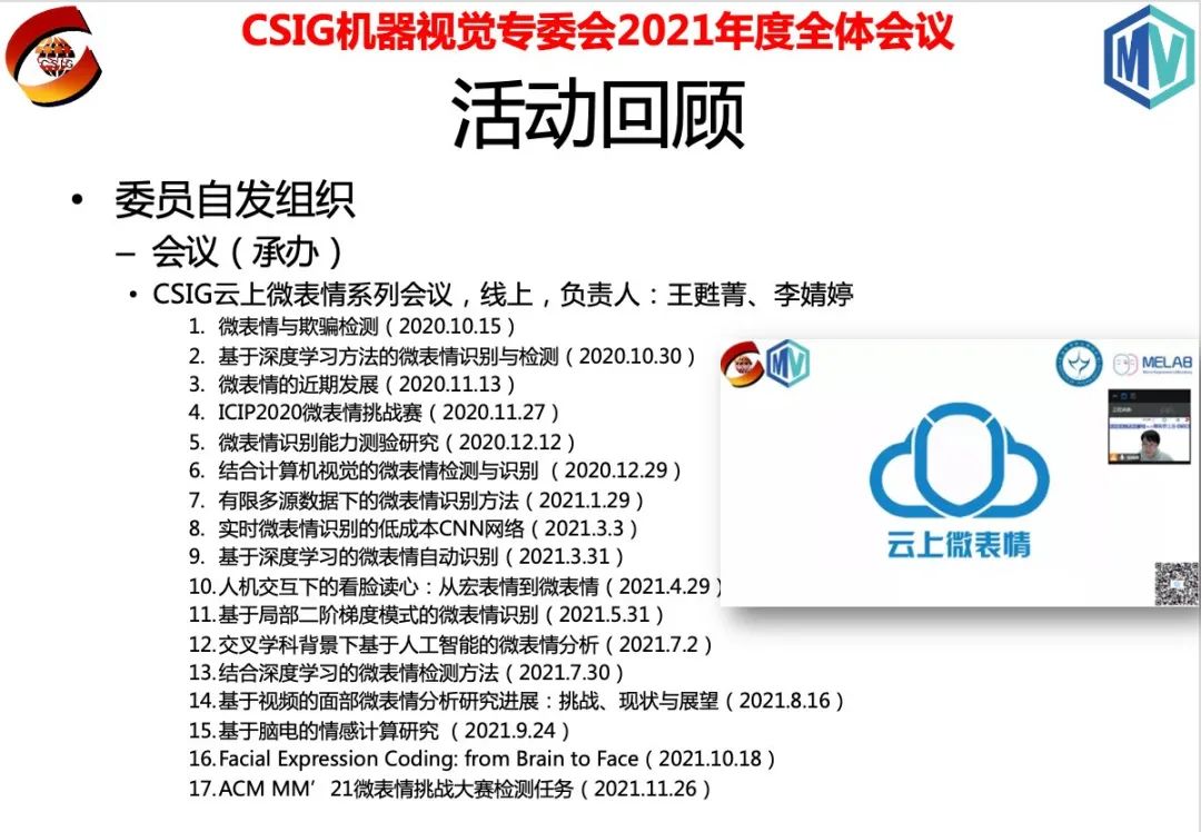 首先是专委会主任、北京大学林宙辰教授的专委年度工作汇报。林主任全面回顾了专委过去一年举办的学术交流活动:包括撰写学科年度进展报告、组织学会公众号《速览》栏目、推荐学会各项奖励和科普专家等。林主任肯定了委员们积极响应和主动承担各项任务的热忱,在没有摊派的情况下,所举办的活动丰富多彩,获得了热烈的反响,例如王甦菁、李婧婷组织的CSIG云上微表情系列会议取得了很好的效果。林主任肯定了各位委员互相协作、不分彼此的工作精神,共同为国家科技工作添砖加瓦、贡献力量。